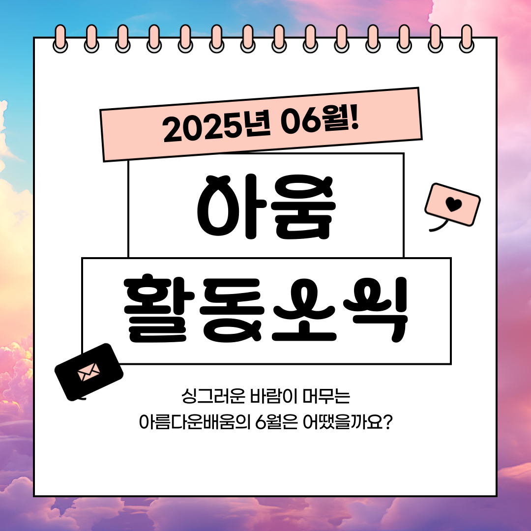 안녕하세요. 사단법인 아름다운배움입니다. 어느덧 2025년의 절반이 지나 7월에 접어들었습니다. 무더위와 장마가 이어지는 요즘, 후원자분들은 잘 지내고 계신가요? 아름다운배움은 오늘도 후원자분들의 응원에 힘입어 열심히 활동하고 있는데요!