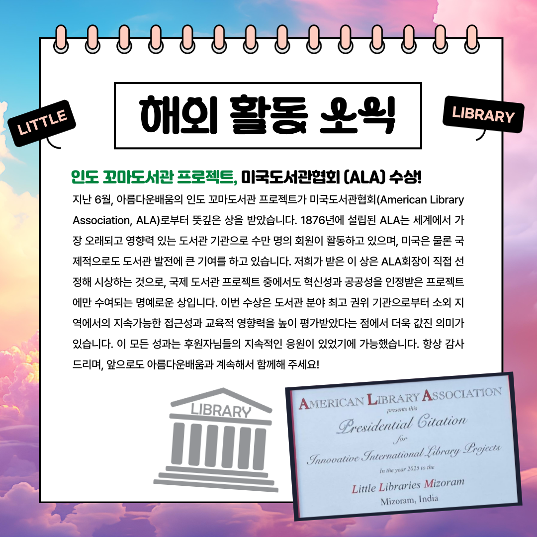 지난 달, 아름다운배움은 어떤 활동을 했을까요? 이번 소식에서는 인도 미조람주의 꼬마도서관 프로젝트가 세계에서 가장 오래되고 권위있는 단체인 미국도서관협회(ALA)로 부터 상을 받은 기쁜 소식과 함께, 강원도 양구에서 진행된 시민교육, 그리고 고흥과 아산에서 새롭게 시작된 꿈사다리학교 28기 멘토워크숍 현장 내용까지 알차게 담았습니다.