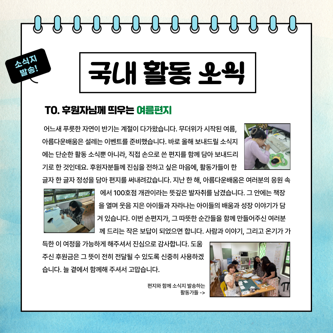 책으로 연결된 마음, 아이들의 반짝이는 상상력, 그리고 후원자님께 전하는 고마운 마음까지! 아름다운배움의 이달 소식이 여러분의 하루에 작은 웃음을 더해드릴 수 있으면 좋겠습니다.함께 만들어가는 아름다운 배움의 여정, 다음 달에도 기대해 주세요💚