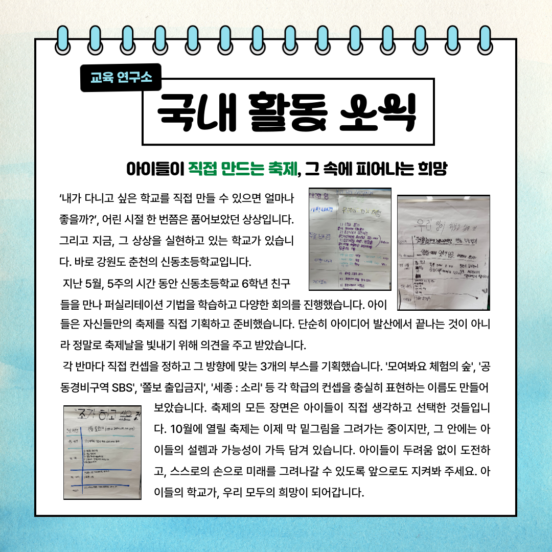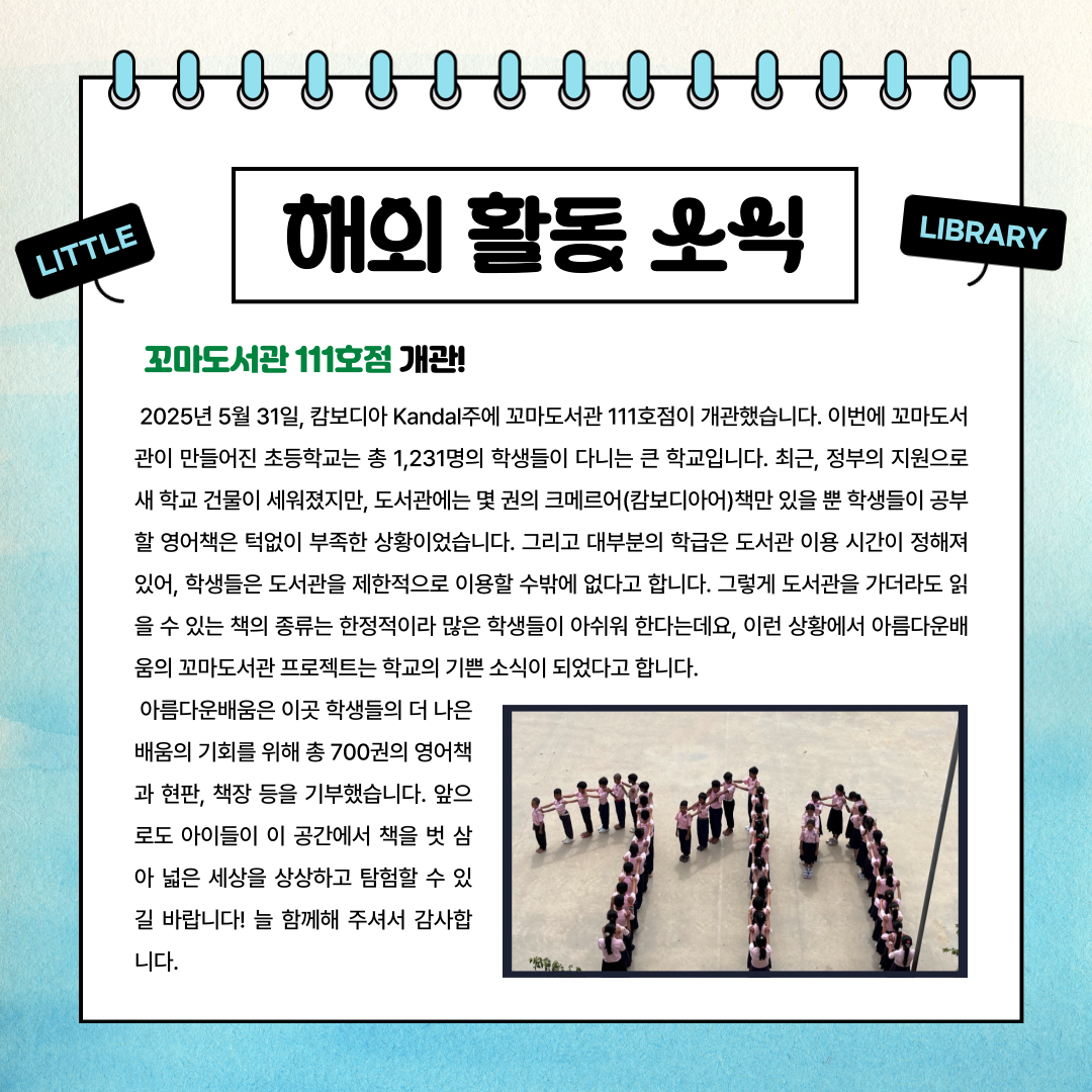 이번 소식지에서는 캄보디아에 문을 연 꼬마도서관 111호점 이야기, 아이들이 직접 상상하고 기획한 춘천 신동초등학교의 ‘내가 다니고 싶은 학교 만들기’ 활동, 그리고 후원자분들께 보내는 15주년 소식지와 손편지 발송 이야기를 전해드립니다.