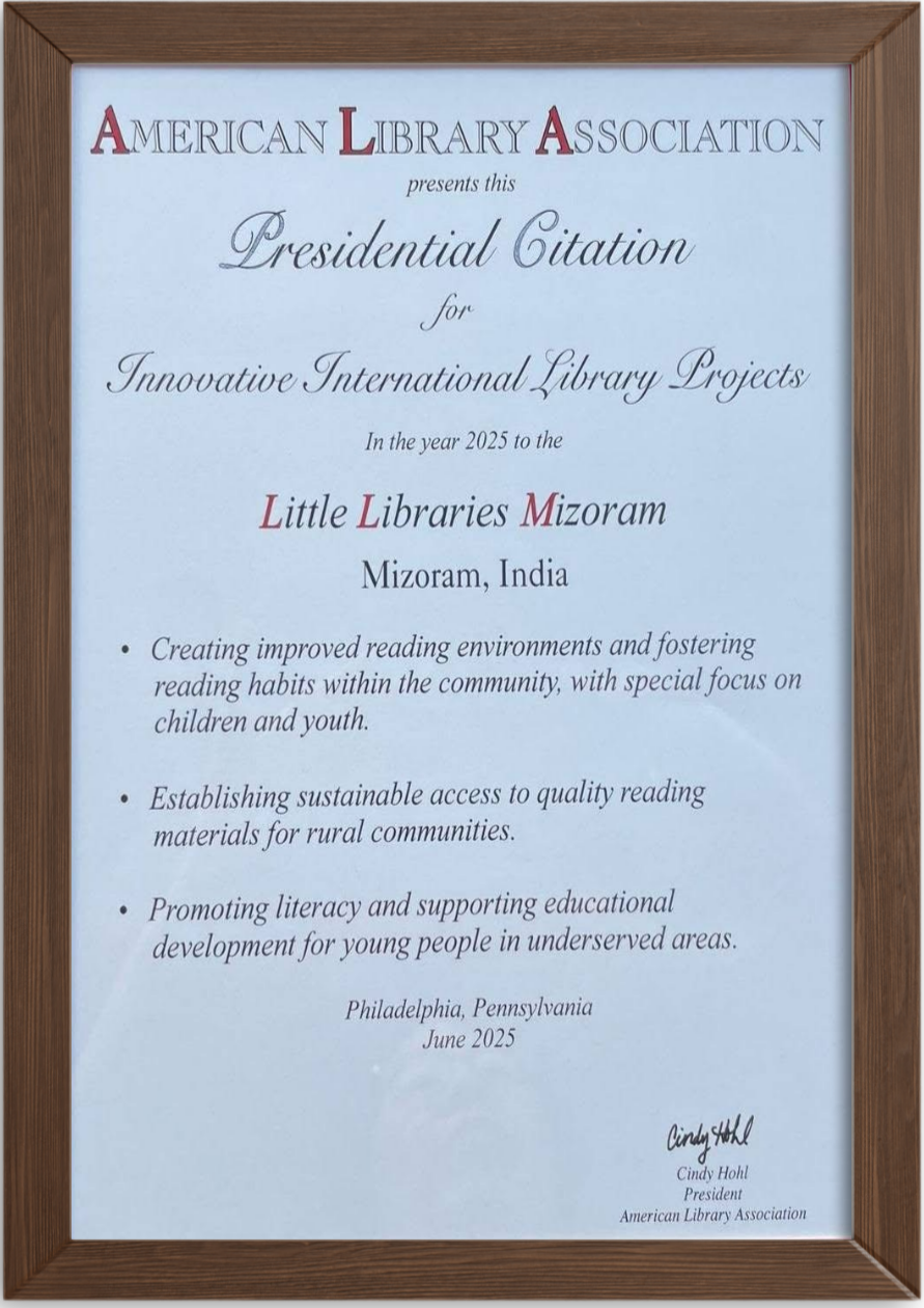 (인도 미조람 꼬마도서관 프로젝트가 받은 2025 혁신국제도서관프로젝트상 수여증)