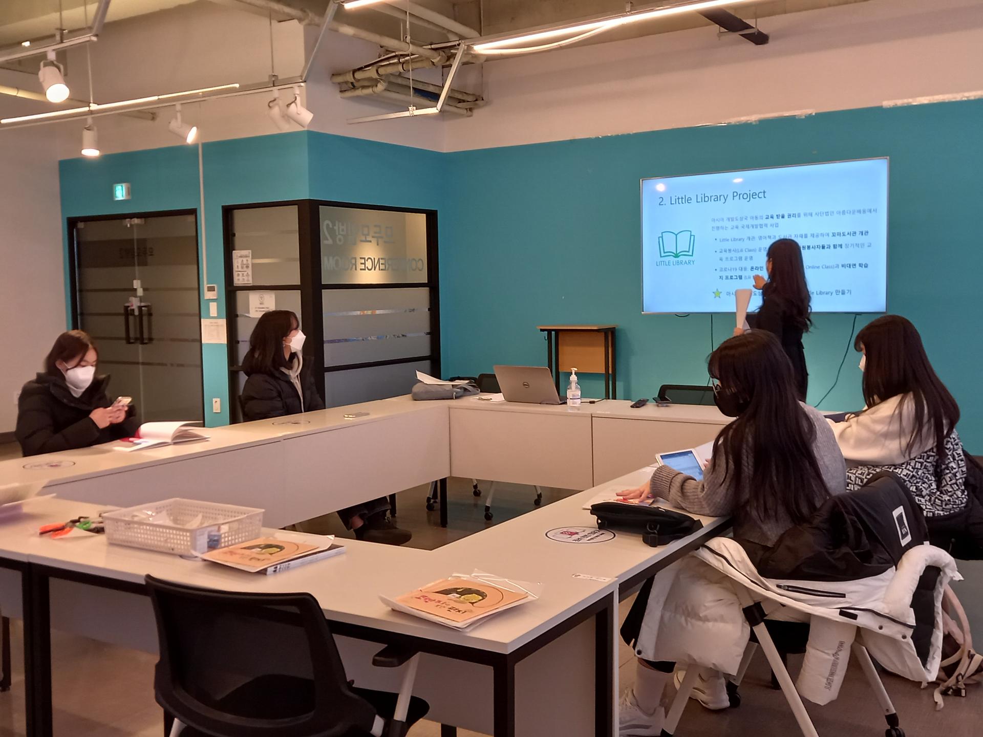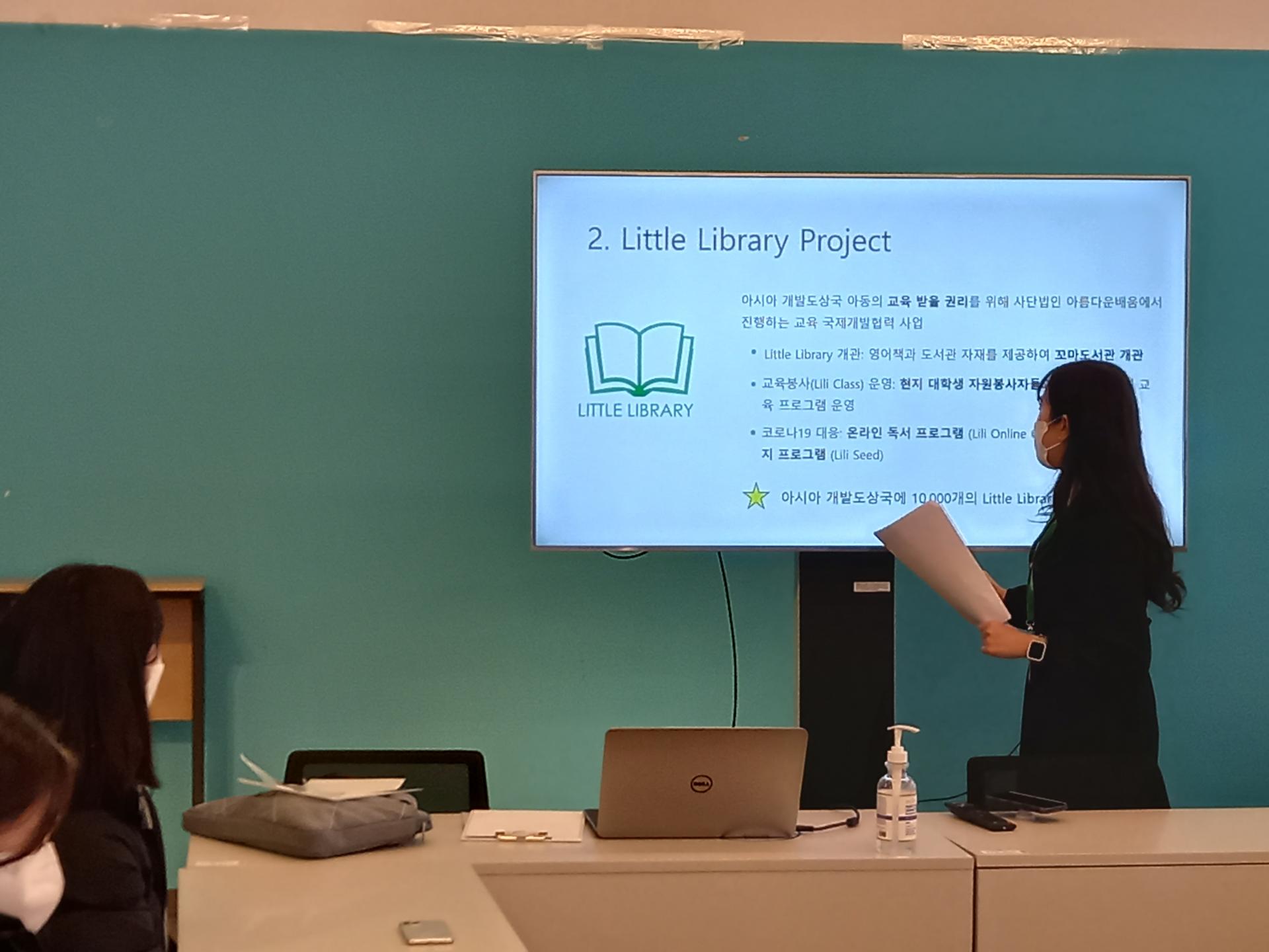 오리엔테이션으로 캄보디아와 리틀 라이브러리 프로젝트 관해 설명하고